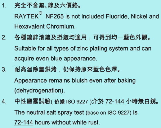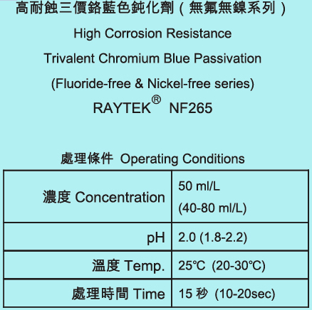 High Corrosion Resistance Trivalent Chromium Blue Passivation (Fluoride-free & Nickel-free series) RAYTEKⓇ NF265