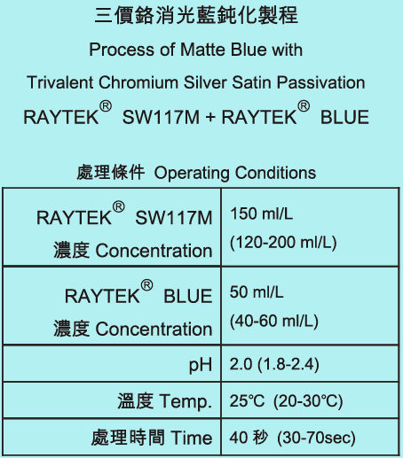 Process of Matte Blue with Trivalent Chromium Silver Satin Passivation RAYTEKⓇ SW117M + RAYTEKⓇ BLUE