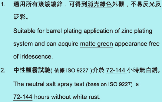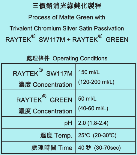 Process of Matte Green with Trivalent Chromium Silver Satin Passivation RAYTEKⓇ SW117M + RAYTEKⓇ GREEN