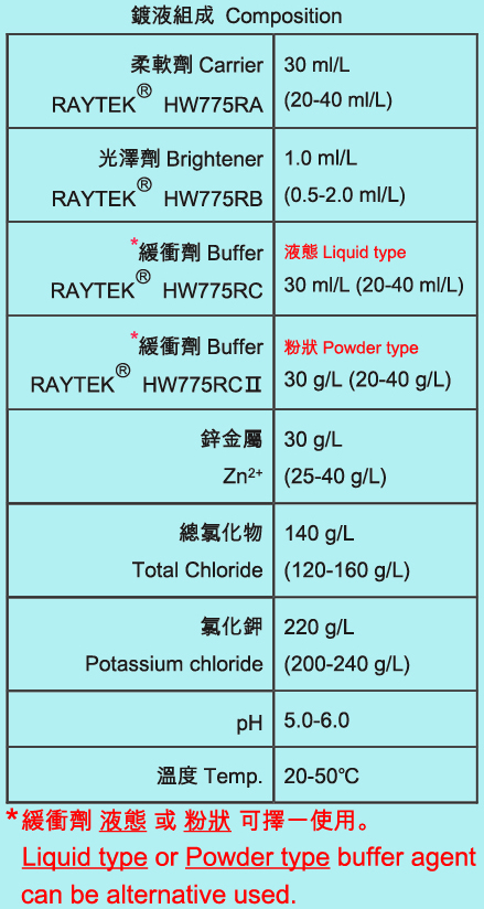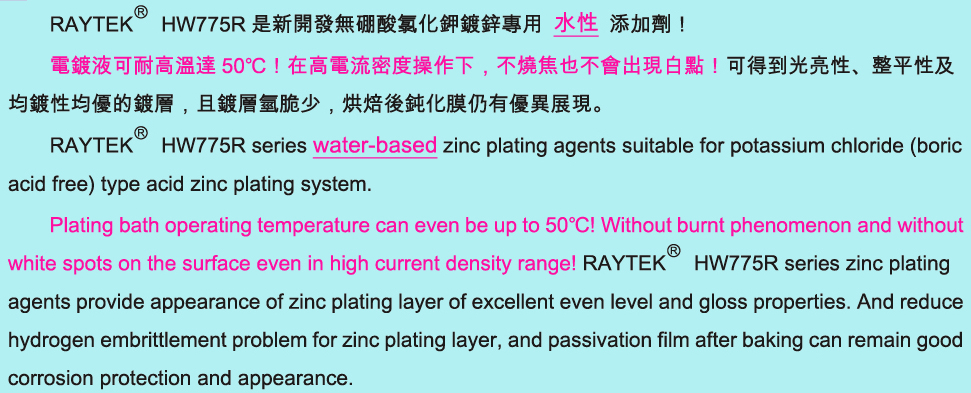 Potassium Chloride (Boric Acid Free) Type Acid Zinc Plating System Agent RAYTEKⓇ HW775R