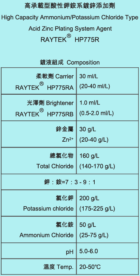 High Capacity Ammonium/Potassium Chloride Type Acid Zinc Plating System Agent RAYTEKⓇ HP775R