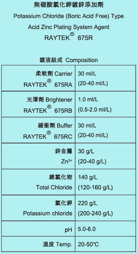 Potassium Chloride (Boric Acid Free) Type Acid Zinc Plating System Agent RAYTEKⓇ 675R