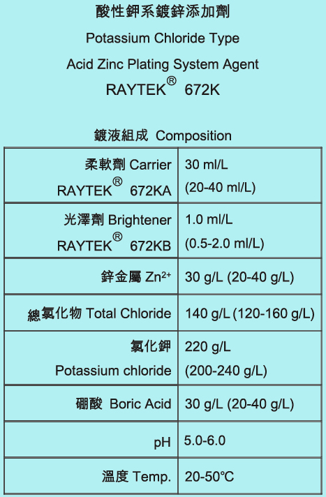 Potassium Chloride Type Acid Zinc Plating System Agent RAYTEKⓇ 672K