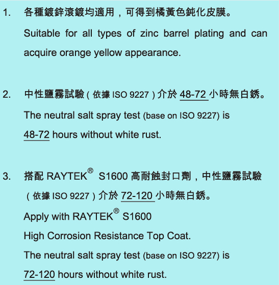 Process of Orange Yellow Dye with Trivalent Chromium Passivation RAYTEKⓇ CR235 + RAYTEKⓇ TY435 + RAYTEKⓇ S1600
