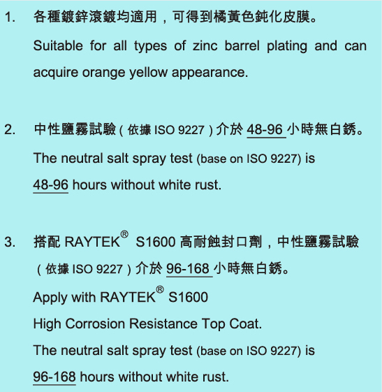三價鉻橘黃色鈍化製程 RAYTEKⓇ CR275 + RAYTEKⓇ TY435 + RAYTEKⓇ S1600