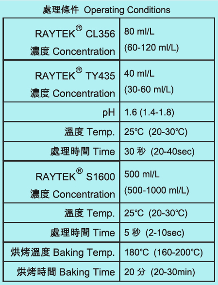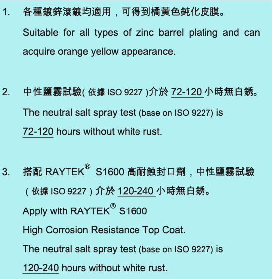 Process of Orange Yellow Dye with Trivalent Chromium Passivation RAYTEKⓇ CL356 + RAYTEKⓇ TY435 + RAYTEKⓇ S1600
