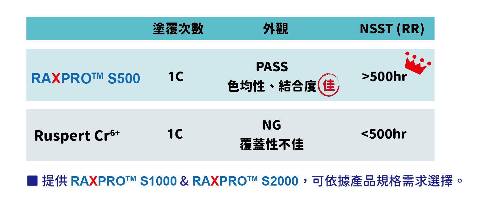 因環保意識抬頭,我司近幾年投入於創新金屬皮膜應用於路銹寶塗裝製程的技術開發, 推出全新開發的「銳仕寶™ RAXPRO™ 系列塗裝前製程」。